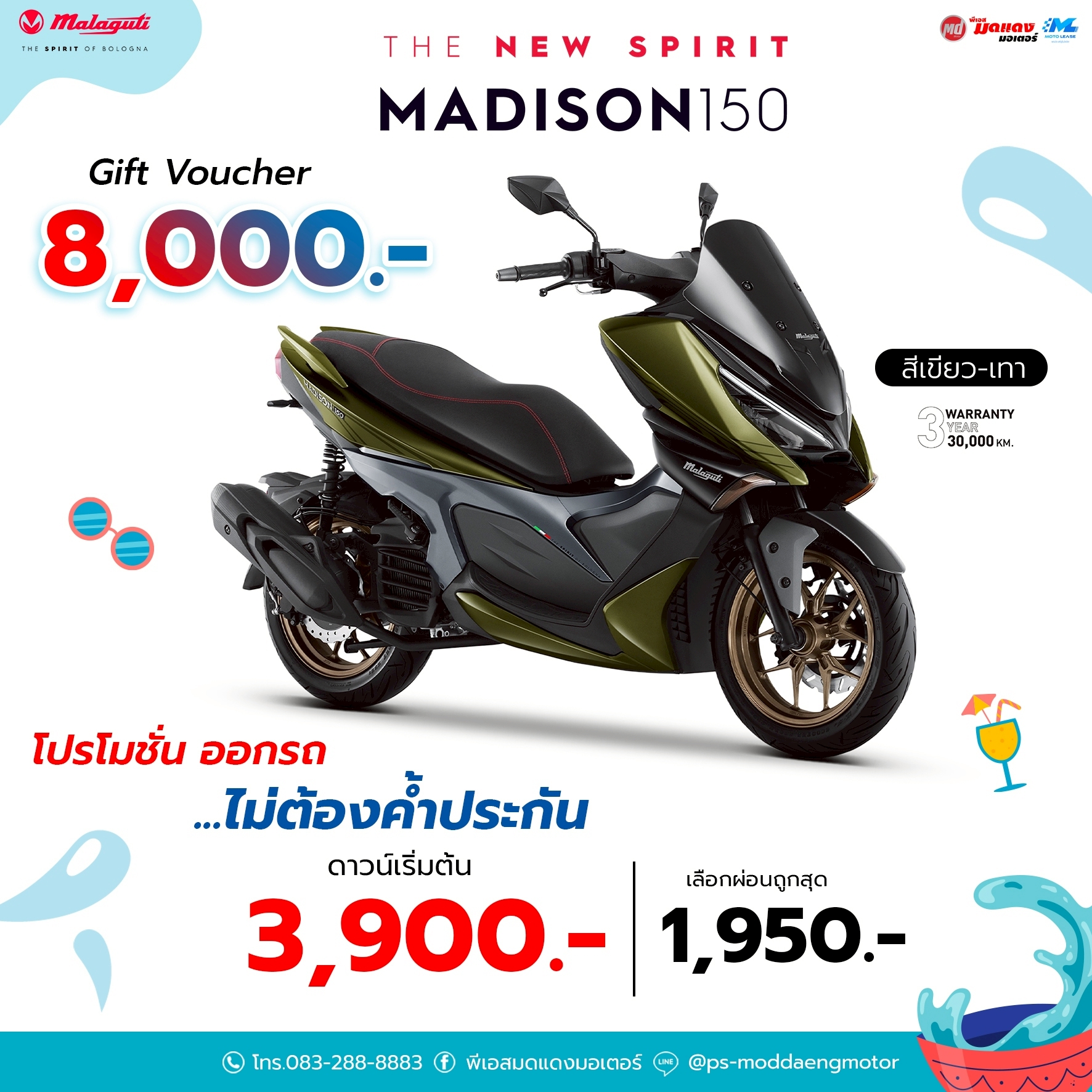 สงกรานต์นี้... แจกหนักสะท้านน้ำ! Madison 150จัดให้ครบ จบที่ 3,900.- ไม่ต้องค้ำประกัน รับ Gift Voucher มูลค่า 8,000 บาท ทันที! Line@ : @ps-moddaengmotor โทร. 083-288-8883 เงื่อนไขเป็นไปตามบริษัทกำหนด