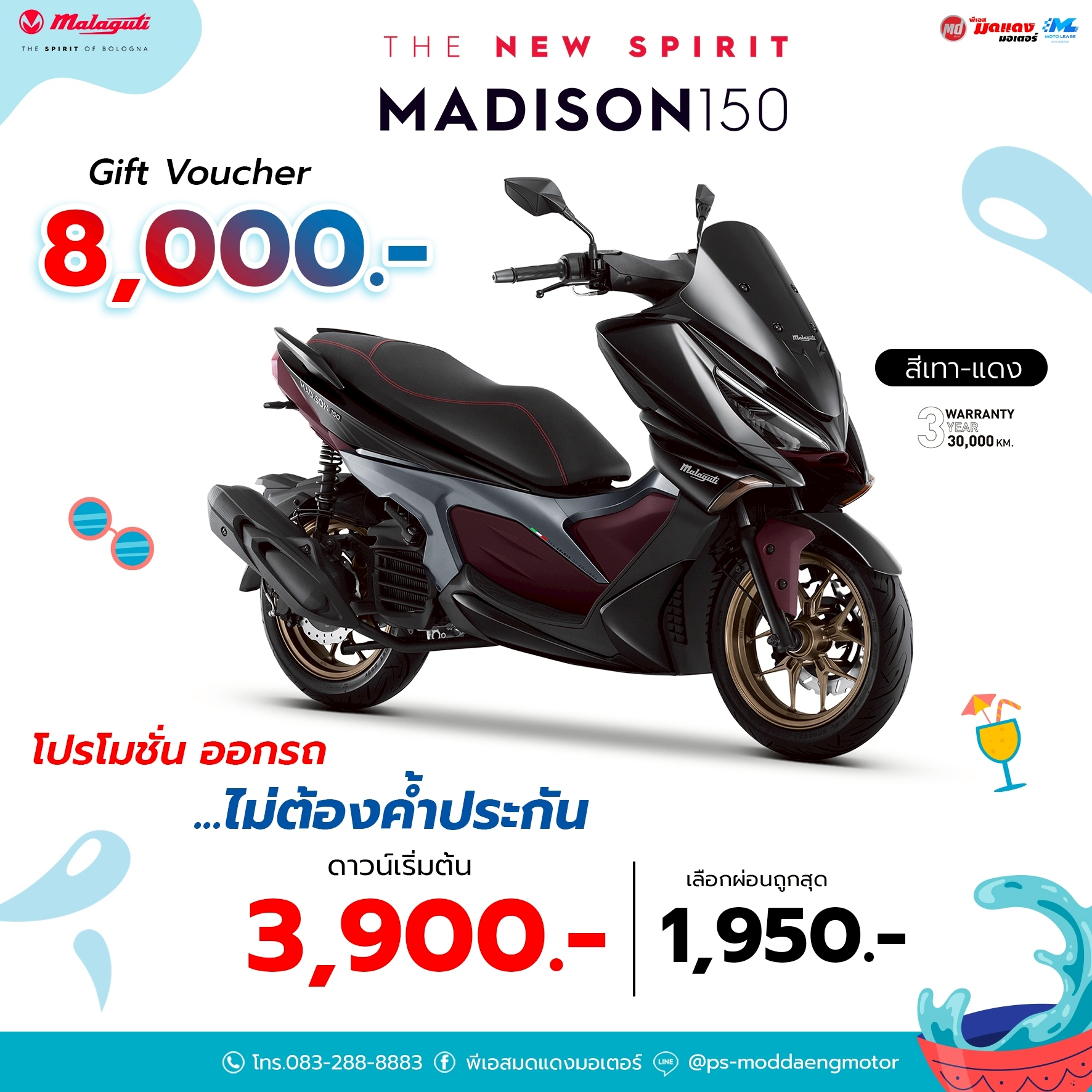 สงกรานต์นี้... แจกหนักสะท้านน้ำ! Madison 150จัดให้ครบ จบที่ 3,900.- ไม่ต้องค้ำประกัน รับ Gift Voucher มูลค่า 8,000 บาท ทันที! Line@ : @ps-moddaengmotor โทร. 083-288-8883 เงื่อนไขเป็นไปตามบริษัทกำหนด